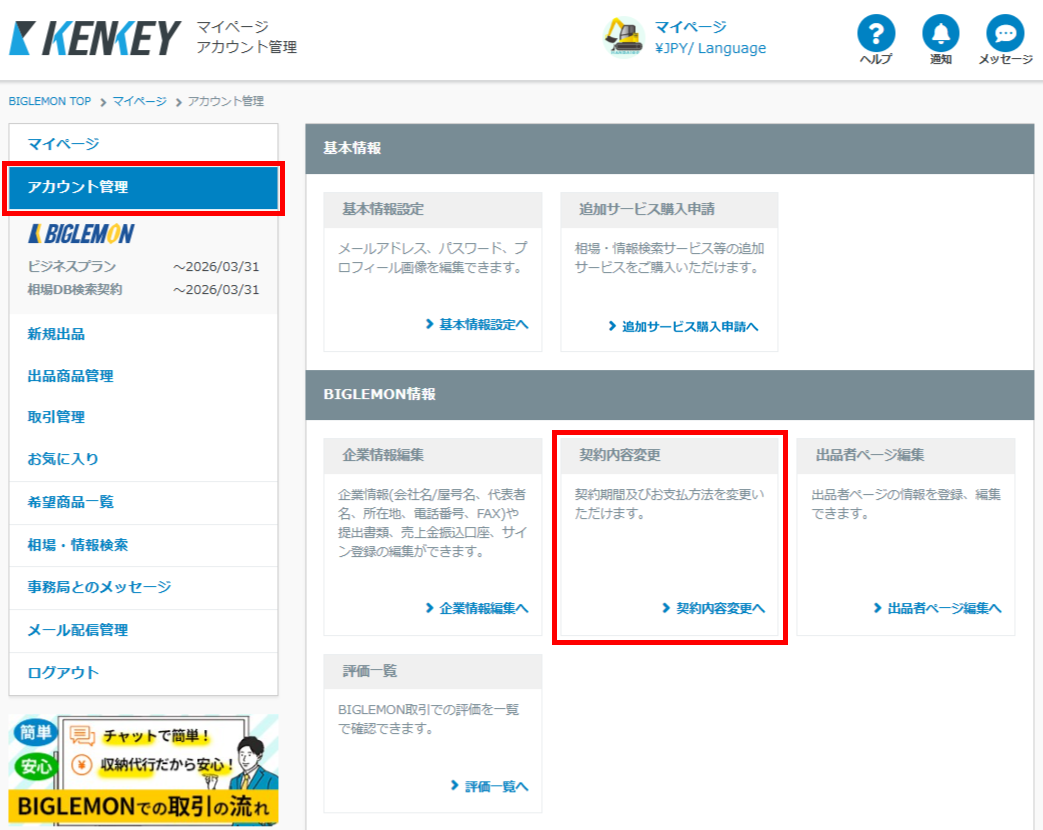 ビジネスプランの利用を継続されない場合、プラン終了月の10日までにマイページの「事務局とのメッセージ」より、BIGLEMON事務局までご連絡ください。
