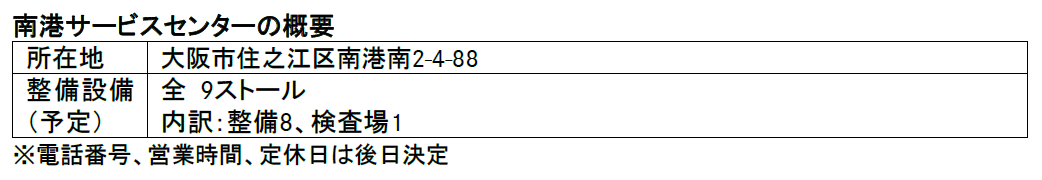また、南港トレーニングセンターの跡地には、新たな販売・サービス拠点として「南港サービスセンター」を新設します。所在する大阪南港エリアは、大阪港の利用企業や阪神高速湾岸線を通過する車両など、物流需要の非常に高いエリアです。