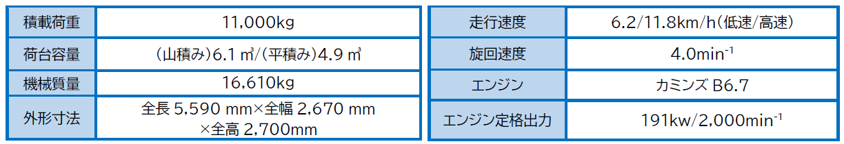積載容量6.1㎥(山積み)・最大積載荷重11t
