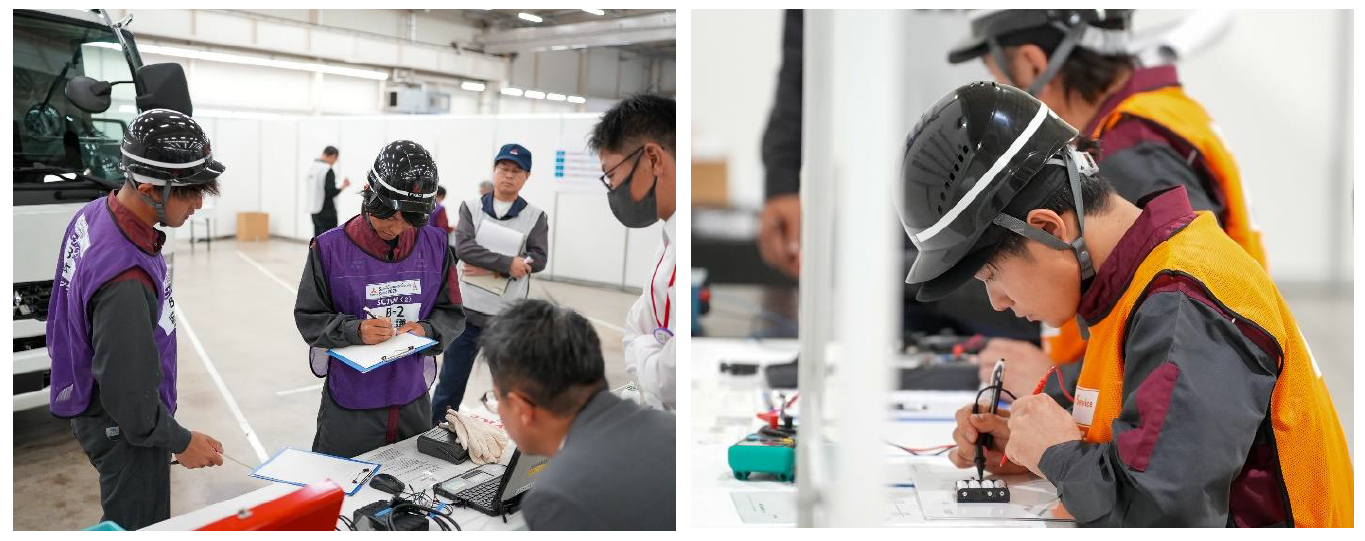 本コンテストには、全国の三菱ふそう特約販売会社11社と、MFTBC地域販売部門から選抜された計105名の選手が出場しました。各特約販売会社、地域販売部門の新車営業1名、パーツ営業1名、サービス3名(フロント1名、メカニック2名)の1チーム5名で構成された計21チームが、学科と実技の課題に取り組みました。サービス・パーツ・新車営業各部門の個人戦に加え、各部門が協力した「3業連携」によるチーム・販売会社対抗戦により、日頃の業務で磨いた技能を披露しました。