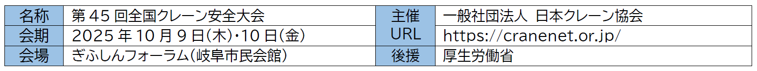 第45回全国クレーン安全大会(主催:一般社団法人 日本クレーン協会、後援:厚生労働省)が、2025年10月9日(木)・10日(金)の2日間、岐阜市の「ぎふしんフォーラム(岐阜市民会館)」にて開催されました。本大会は、製造・建設・運用に携わる企業や関係者が一堂に会し、クレーンの安全利用に関する最新の知見や技術を共有し、労働災害の防止と安全文化の浸透を目的とした全国規模のイベントとなります。