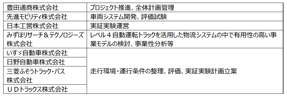 ドライバー不足などの社会課題解決に向け、受託者4社は、商用車メーカー4社および物流事業者をはじめとする関係者とともに、官民が一体となって2026年度以降の幹線道路における自動運転トラックの社会実装を目指しています。
