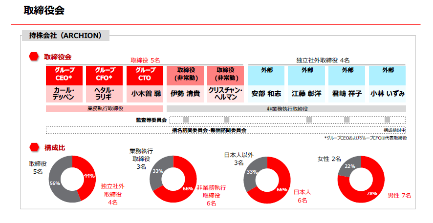 ARCHIONの取締役会は、10月9日に公表した取締役5名に加え、4名の独立社外取締役を含む全9人で構成されます。強固で透明性の高いガバナンスを構築するとともに、4社協業のシナジーを最大化し、グループの持続的成長と継続的な企業価値向上を実現する人選としています。独立社外役員においては、企業経営経験や専門的知見としてガバナンス・リーガル、財務・会計のスキルを備えた人材を選定しており、企業経営戦略等の大きな方向性を示し適切なリスクマネジメントを支えながら、経営陣に対する実効性の高い監督を期待しています。