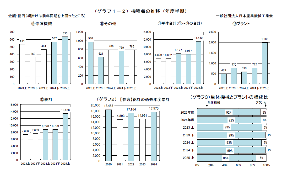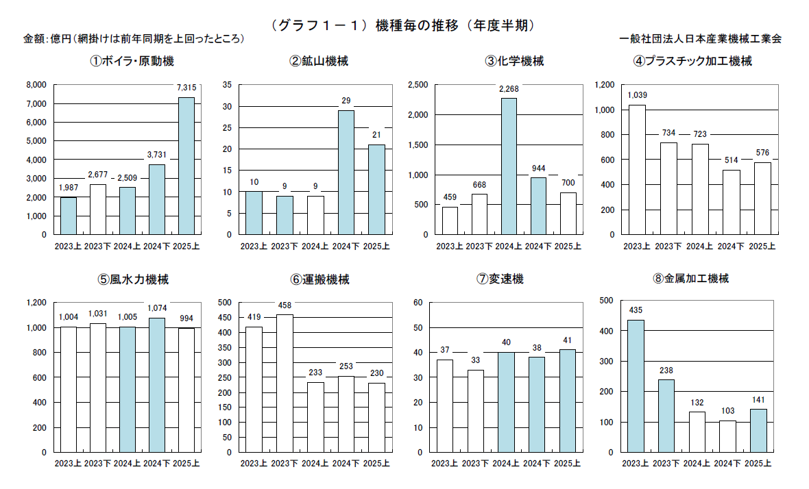 2025年度上半期の主要約70社の産業機械輸出は、アジアが増加し、前年同期比53.1%増の1兆3,428億円となった。