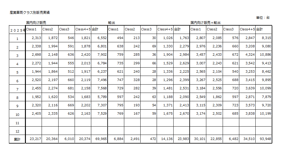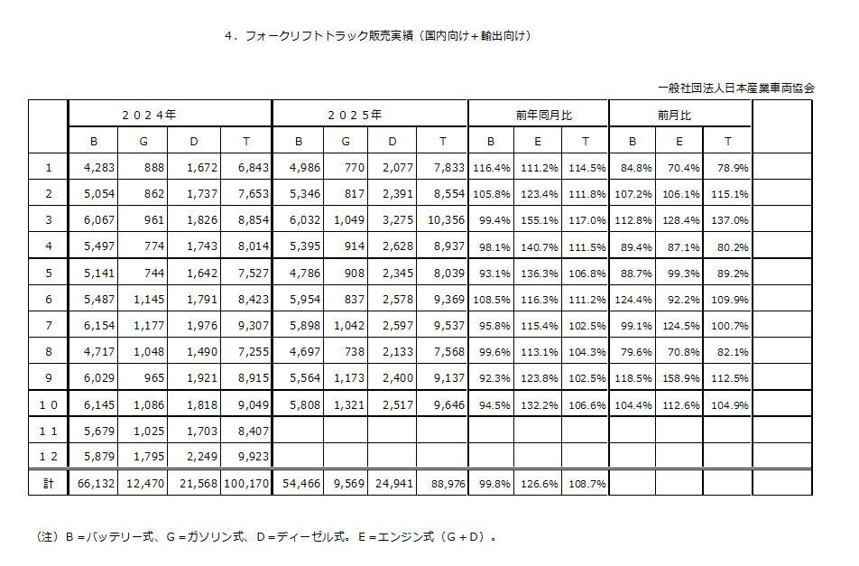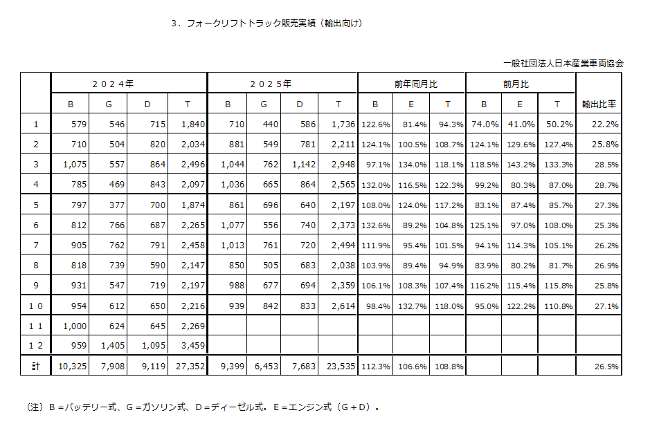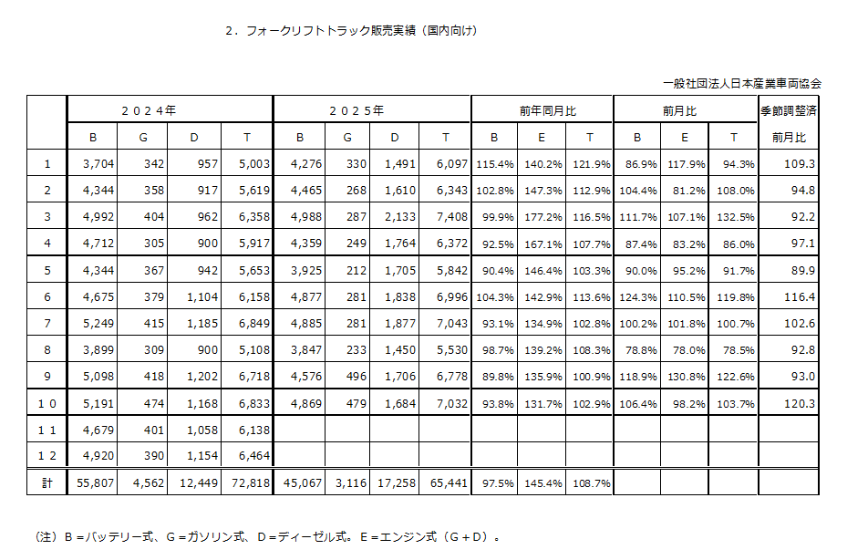 日本産業車両協会により、令和7年10月分のフォークリフト統計が発表された。