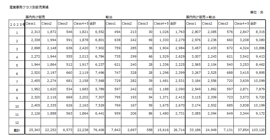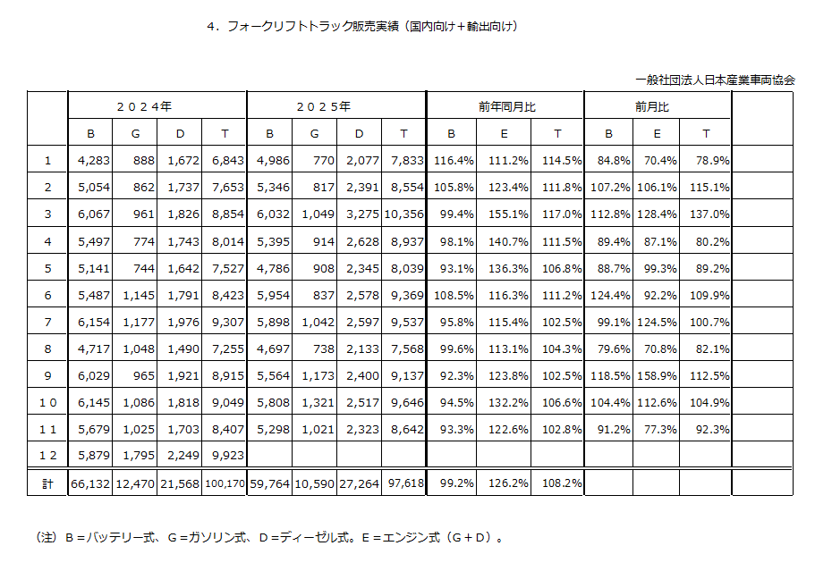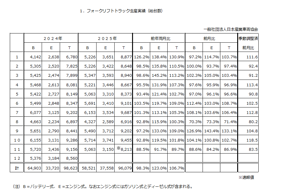 日本産業車両協会により、令和7年11月分のフォークリフト統計が発表された。