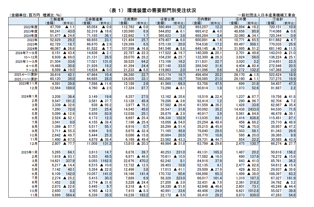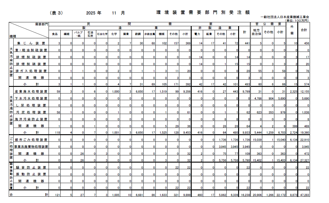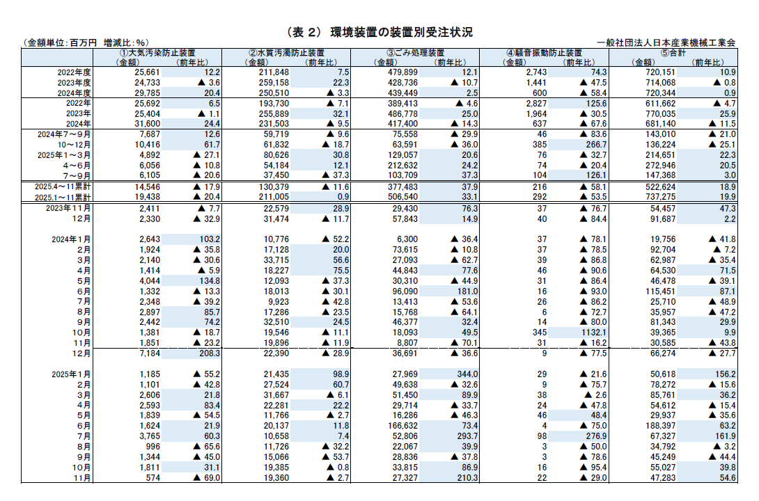 鉄鋼、機械向け産業廃水処理装置が増加したものの、官公需向け下水汚水処理装置、汚泥処理装置の減少により、▲2.7%減となった。