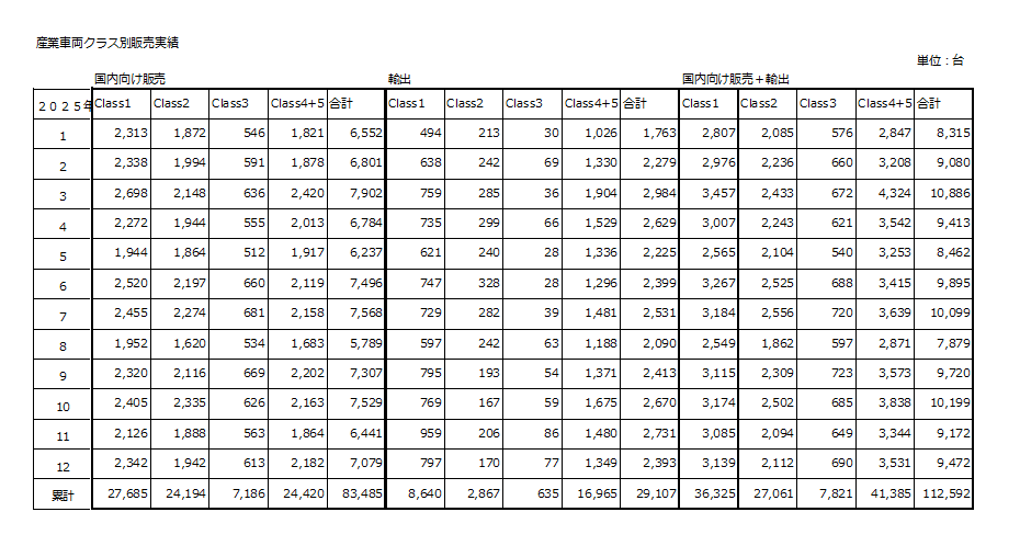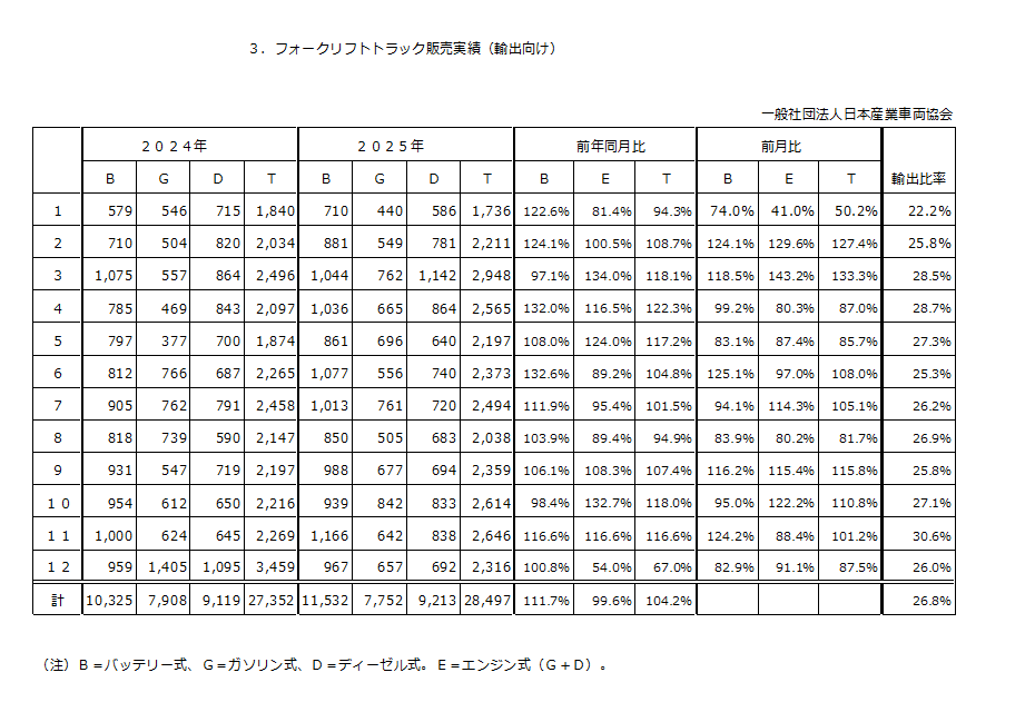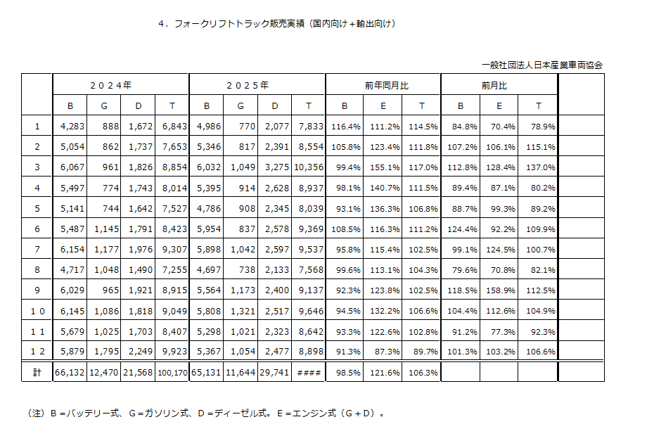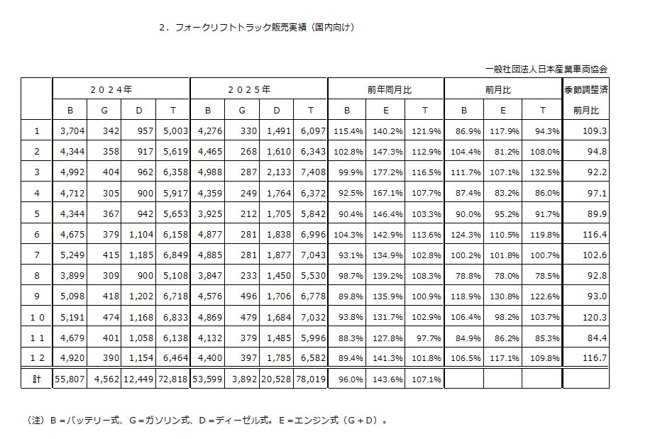 日本産業車両協会により、令和7年12月分のフォークリフト統計が発表された。