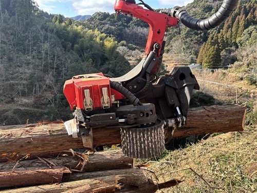 日本では、チェーンソーによる伐倒が主流で、伐倒後に横たわった材を掴む作業が多く発生します。こうしたニーズに対応するため、このたび、伐倒後の材の掴みやすさに優れたS92を日本に導入しました。S92は、林業機械の製造販売を行うコマツフォレストAB(スウェーデンのコマツ100%子会社)製のナイフキャリータイプ(※1)のハーベスターヘッドで、曲がり材にも対応しやすく、木材へのダメージが少ない構造が特長です。材端部への送材から玉切りまでを自動で行う機能や、低摩擦での送材・枝払いを実現するナイフ制御機能などにより、高い生産性と整備性を発揮します。さらに、造材量や造材位置を見える化するアプリ「ZOUZAIウォッチャー」にも対応し、林業施業の効率化に貢献します。