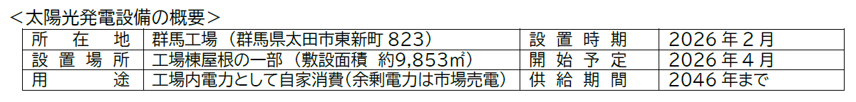当社は中期経営計画(2025~2027)において「サステナビリティ経営の実践」を重要方針の一つとして掲げ、環境負荷低減に向けた取り組みを進めています。これまでLED照明の導入など省エネルギー施策を推進してきました。今回、群馬工場の屋根を活用して太陽光発電設備を導入することで、再生可能エネルギーの利用拡大と継続的なCO2排出量削減を推進します。