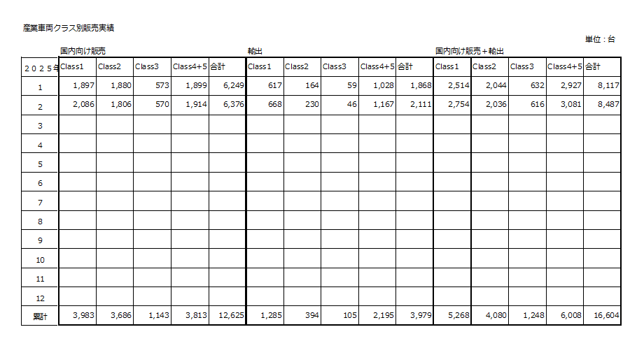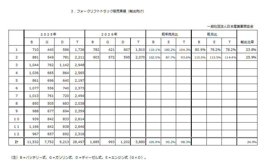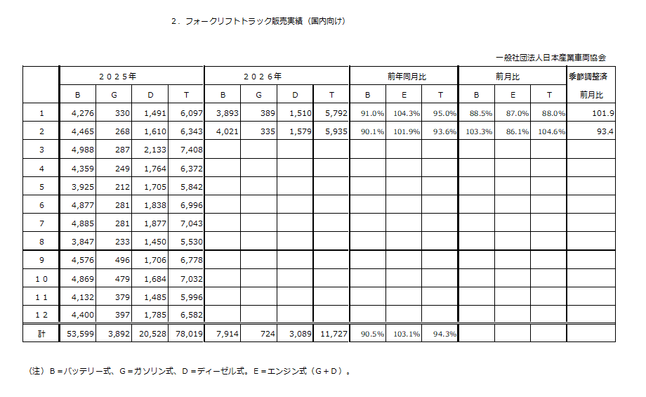 日本産業車両協会により、令和8年2月分のフォークリフト統計が発表された。