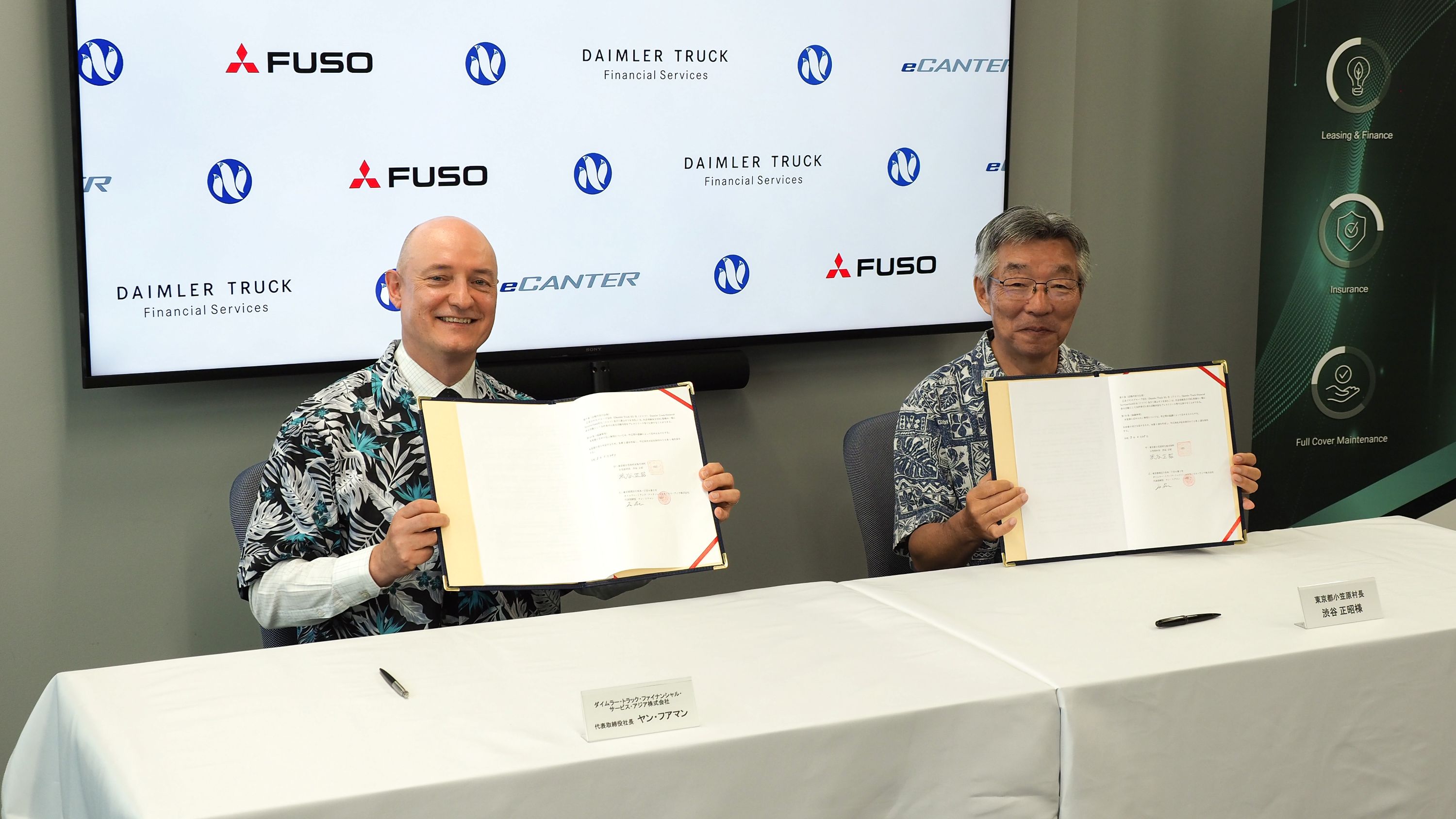 ダイムラー・トラック・ファイナンシャルサービス・アジア株式会社(本社:東京都港区、代表取締役社長:ヤン・フアマン、以下 DTFSA)は、小笠原村(東京都小笠原村、村長:渋谷正昭)に対し三菱ふそうトラック・バス株式会社(本社:神奈川県川崎市、代表取締役社長・CEO:カール・デッペン、以下 MFTBC)製の電気小型トラック「eCanter」を寄付することを決定し、2026年3月25日にDTFSAと小笠原村で寄付に関する覚書(MoU)の締結式をDTFSA本社にて行いました。小笠原諸島でのEVトラック導入は初となるほか、UNESCO世界自然遺産に登録された国内の離島で「eCanter」が導入されるのは小笠原諸島が初めてとなります。小笠原村への「eCanter」の納車は2026年7月を予定しています。